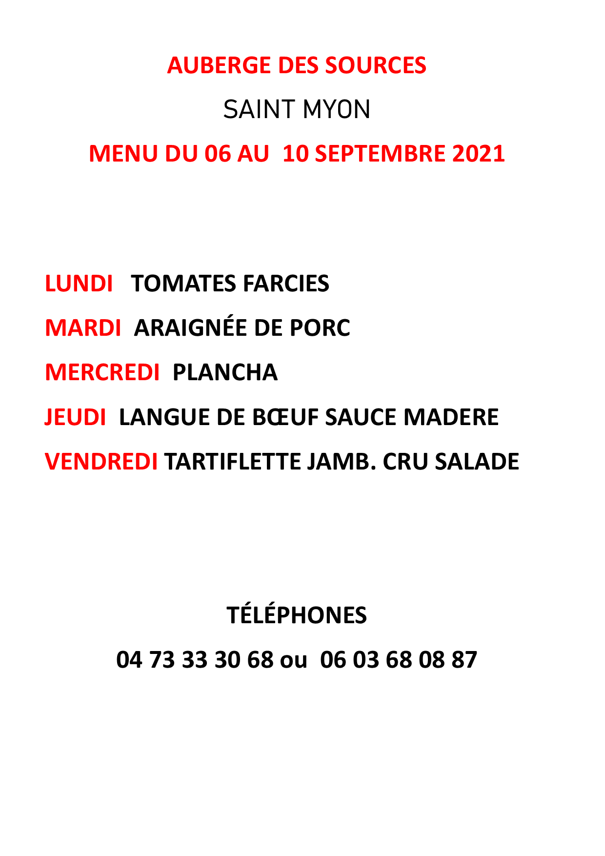 Menu de l’auberge des sources du 06 au 10 septembre 2021