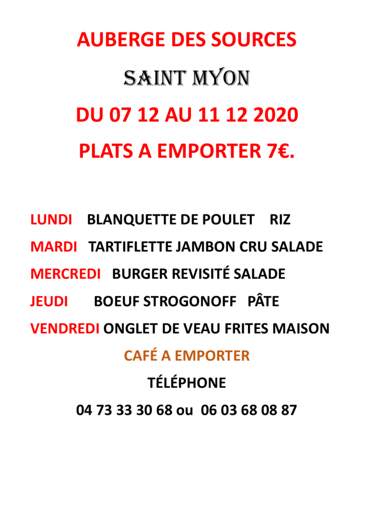 Veuillez trouver ci-dessous le menu de l’Auberge des Sources du 07 au 11 décembre 2020