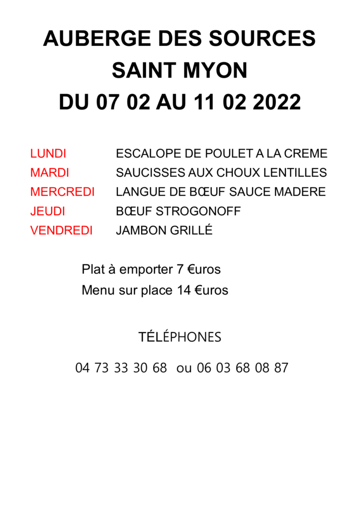 Veuillez trouver ci-dessous le menu de l’Auberge des Sources du 07 au 11 février 2022