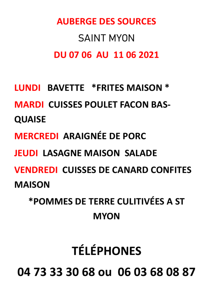 Veuillez trouver ci-dessous, le menu de l’Auberge des Sources du 07 au 11 juin 2021