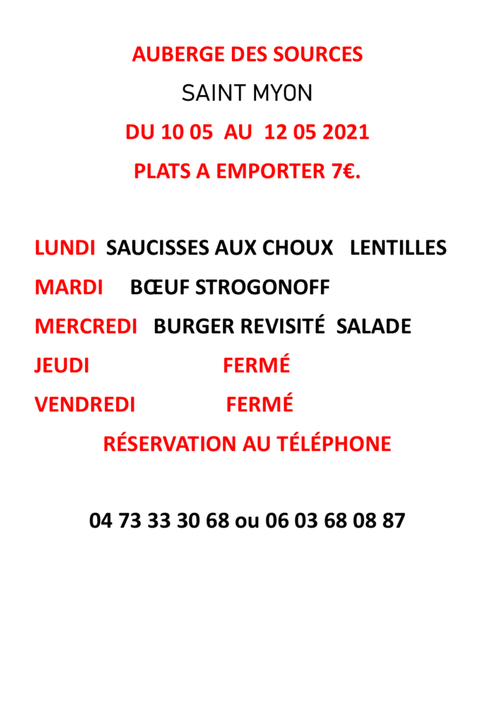 Veuillez trouver ci-dessous le menu de l’auberge des sources du 10 au 14 mai 2021.