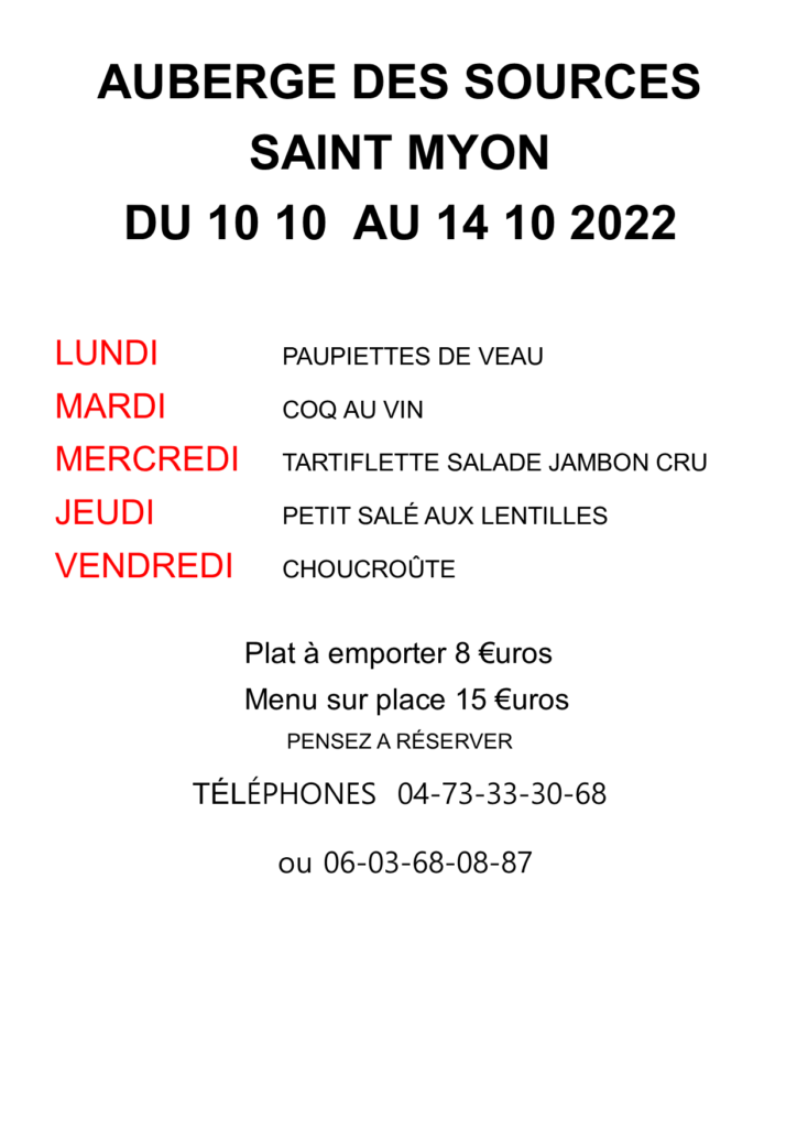 Veuillez trouver ci-dessous le menu de l’Auberge des Sources du lundi 10 octobre au vendredi 14 octobre 2022.
