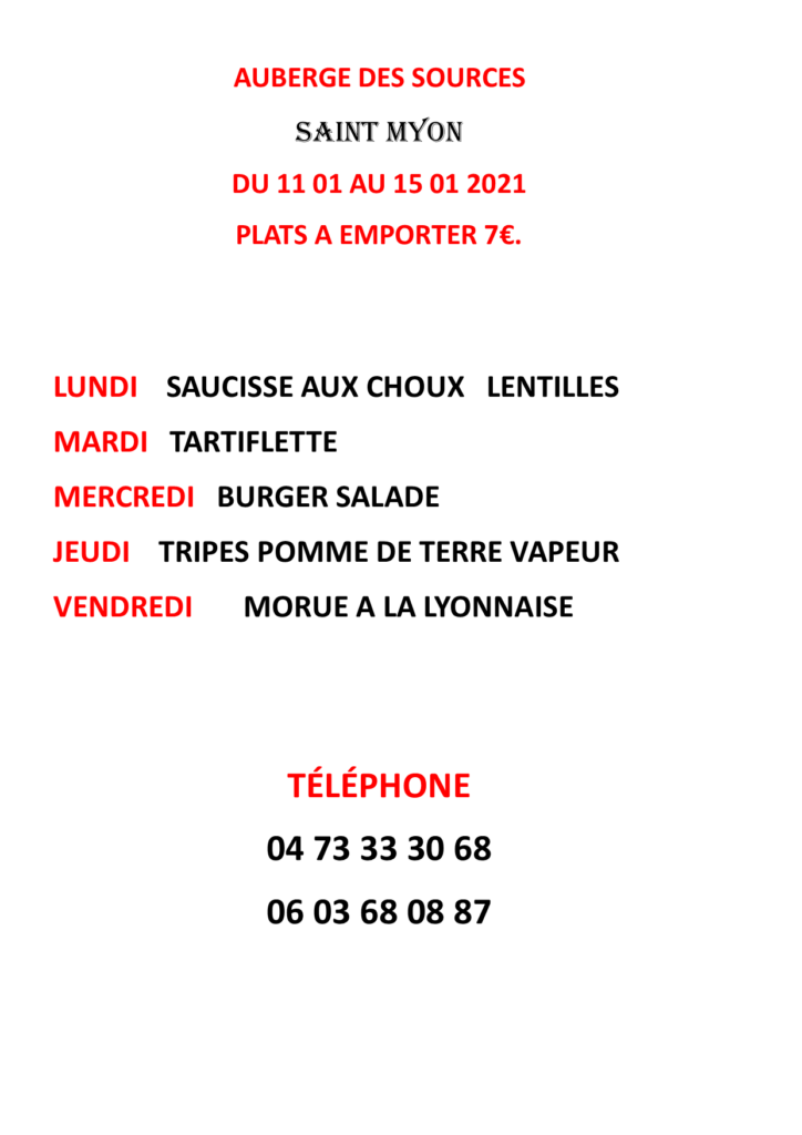 Veuillez trouver ci-dessous le menu de l’auberge des Sources du lundi 11 au vendredi 15 janvier 2021.