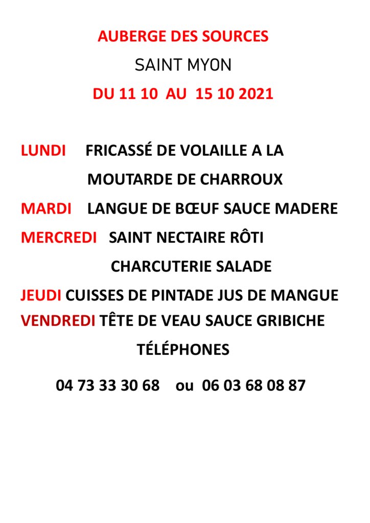 Veuillez trouver ci-dessous le menu de l’auberge des Sources du lundi 11 octobre au vendredi 15 octobre 2021.