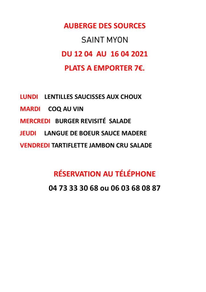 Veuillez trouver ci-dessous le menu de l’auberge des sources du 12 au 16 avril 2021