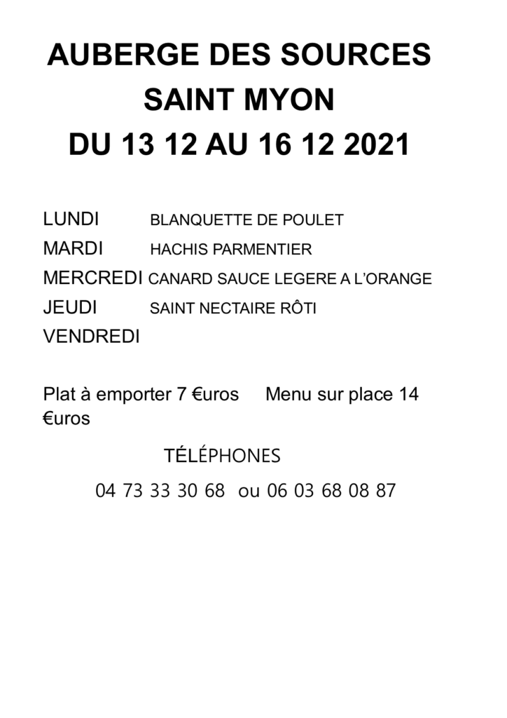 Veuillez trouver ci-dessous le menu de l’auberge des sources du 13 au 17 décembre 2021