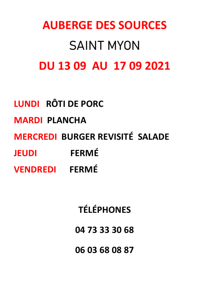 Veuillez trouver ci-dessous le menu de l’auberge des Sources du 13 au 17 septembre 2021.