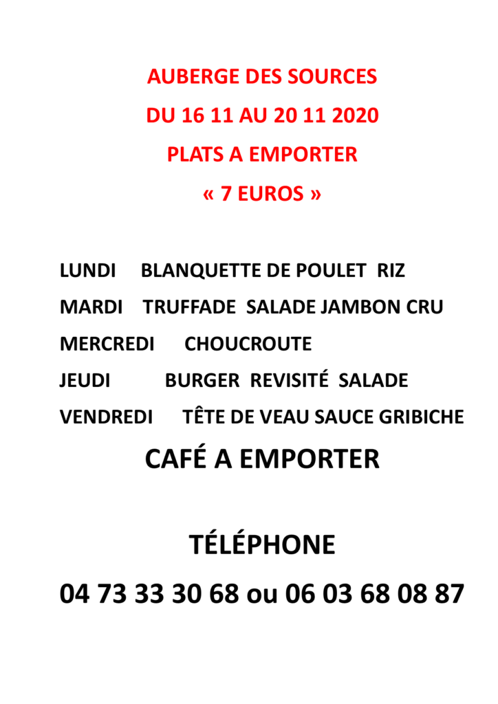 Veuillez trouver ci-dessous le menu de l’auberge des sources du 16 au 20 novembre 2020 exclusivement a emporter.
