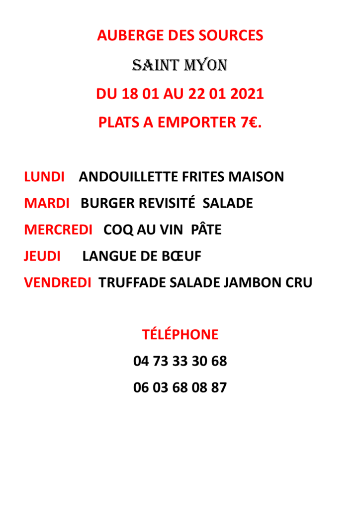 Veuillez trouver ci-dessous le menu de l’auberge des Sources du 18 au 22 janvier 2021.