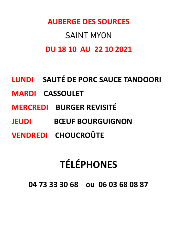 Veuillez trouver ci-dessous le menu de l’Auberge des Sources du 18 au 22 octobre 2021