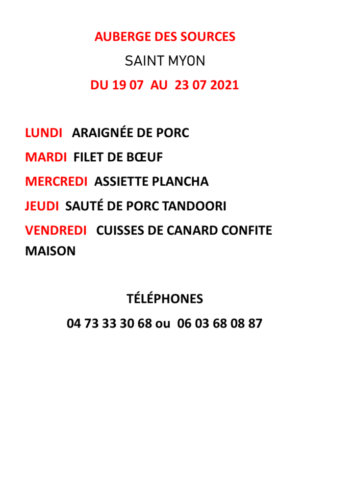 Veuillez trouver le menu de l’auberge des Sources du 19 au 23 juillet 2021