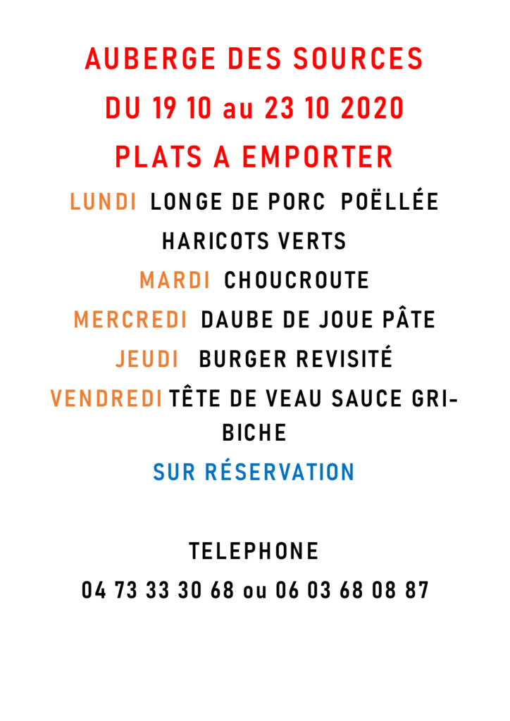 Menu de l’auberge des Sources du 19 au 23 octobre 2020 Veuillez trouver ci-dessous le menu de l’Auberge des Sources du 19 au 23 octobre 2020 Partager : Communauté
