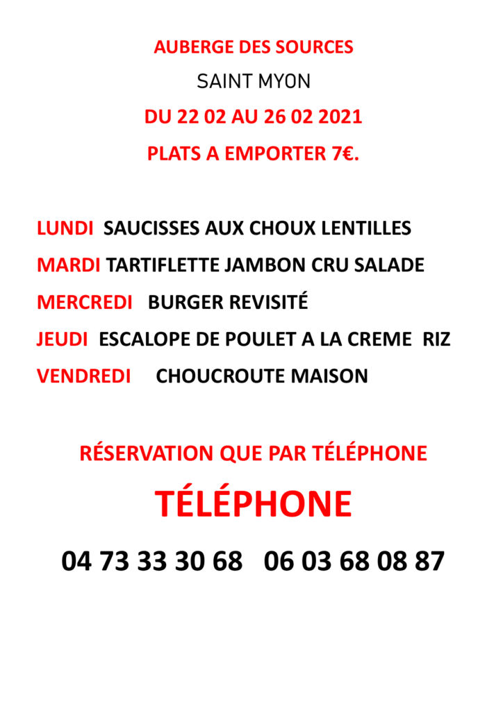 Veuillez trouver ci-dessous le menu de l’auberge des sources à réserver uniquement par téléphone du 22 au 26 février 2021.