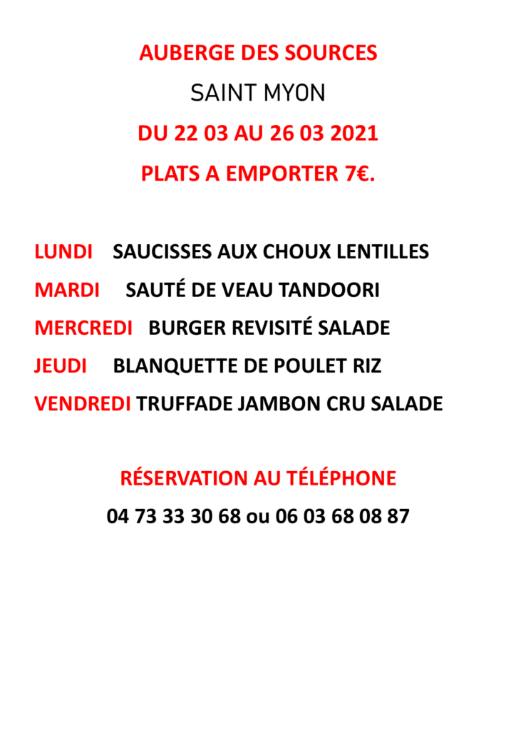 Menu de l’auberge des Sources du 22 au 26 mars 2021 Veuillez trouver le menu de l’auberge des sources du 22 au 26 mars 2021 Partager : Communauté