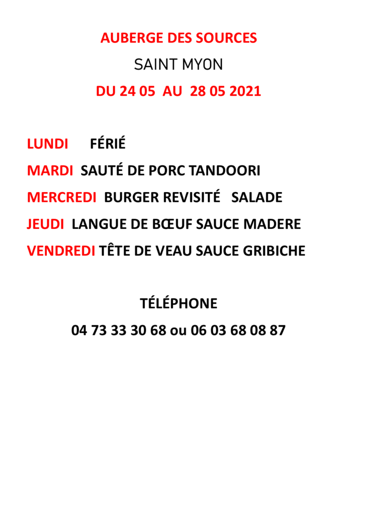 Veuillez trouver ci-dessous le menu de l’auberge des sources du 25 au 28 mai 2021.