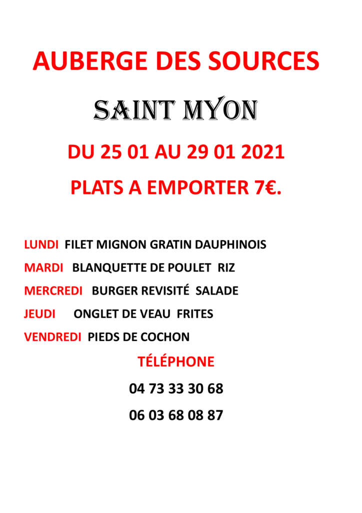 Veuillez trouver ci-dessous le menu de l’auberge des Sources du 25 au 29 Janvier 2021