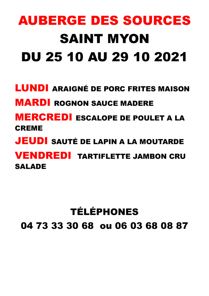 Veuillez trouver ci-dessous, le menu de l’Auberge des Sources du 25 au 29 octobre 2021.