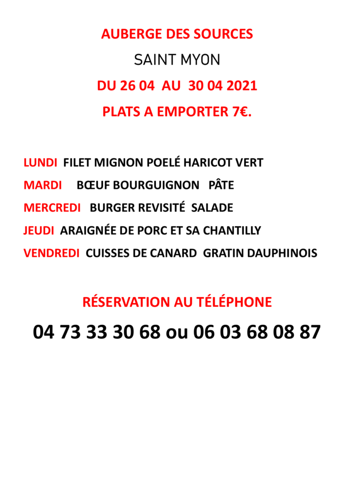 Veuillez trouver en pièce jointe le menu de l’auberge des Sources du 26 au 30 avril 2021