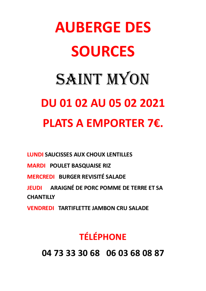 Menu de l’Auberge des sources du lundi 01er au vendredi 05 février 2021