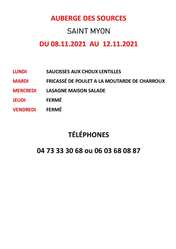 Menu de l’auberge des Sources du lundi 08 au vendredi 12 novembre 2021