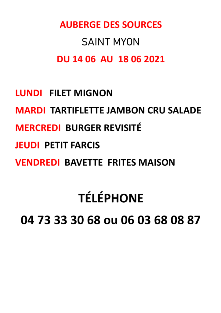 Veuillez trouver ci-dessous le menu de l’Auberge des Sources du lundi 14 au 18 juin 2021.