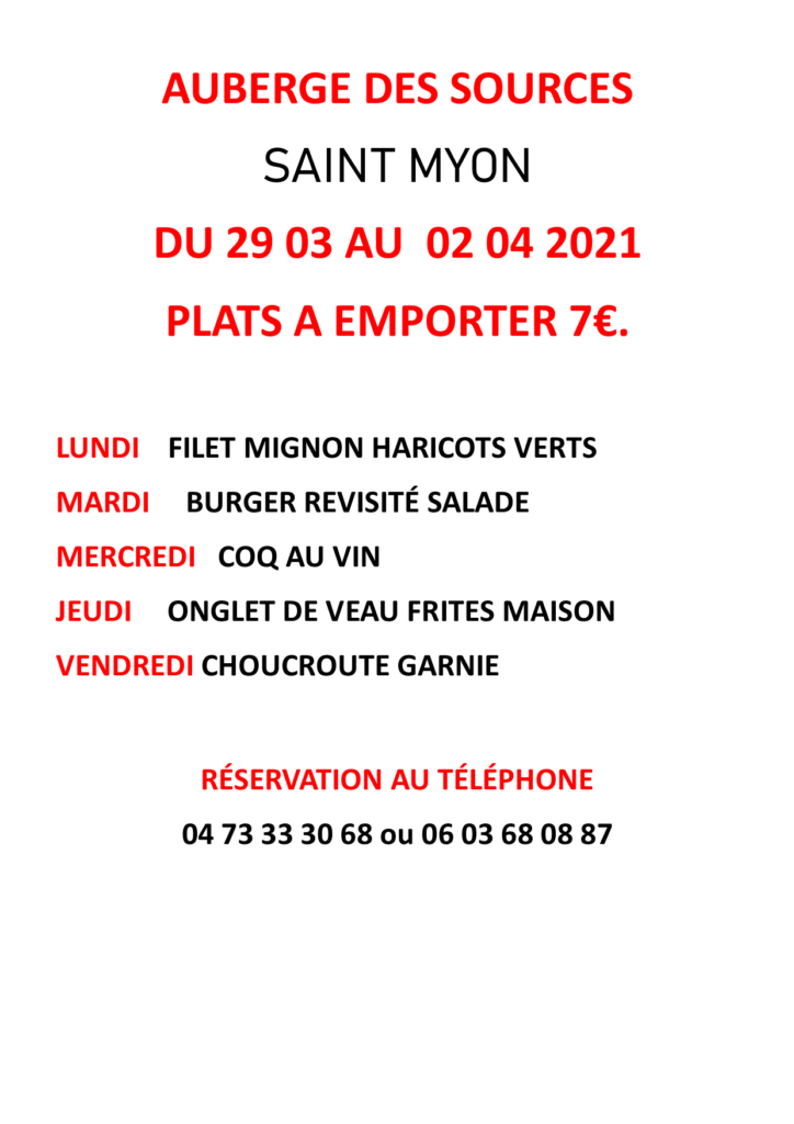 Veuillez trouver le menu de l’Auberge des Sources du lundi 29 mars au vendredi 02 avril 2021.