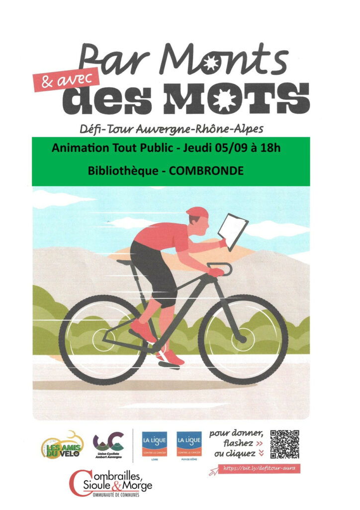 Le défi-tour passe par Combronde ! Aussi, nous vous donnons rendez-vous le jeudi 05 septembre à 18h à la médiathèque de Combronde, pour venir découvrir les histoires et merveilles de la région. Ouvert à tous, gratuit, sur inscription. Plus d’informations à la médiathèque de Combronde (04.73.33.35.76 ou mediatheque-combronde@comcom-csm.fr)