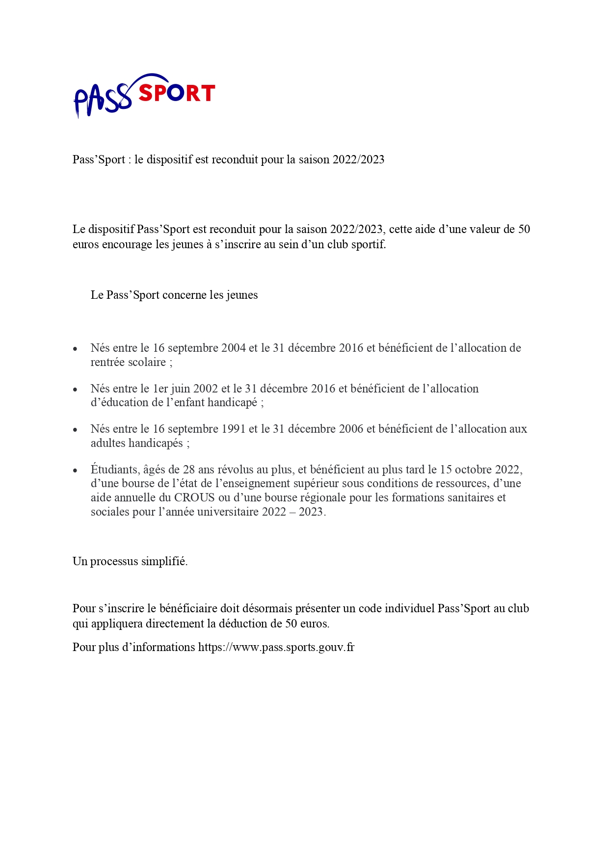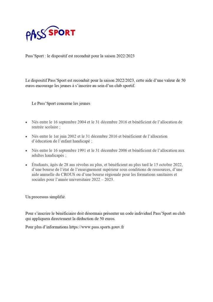 Le dispositif Pass’Sport est reconduit pour la saison 2022/2023, cette aide d’une valeur de 50 € encourage les jeunes à s’inscrire au sein d’un club sportif. Pour plus d’informations https://www.pass.sports.gouv.fr