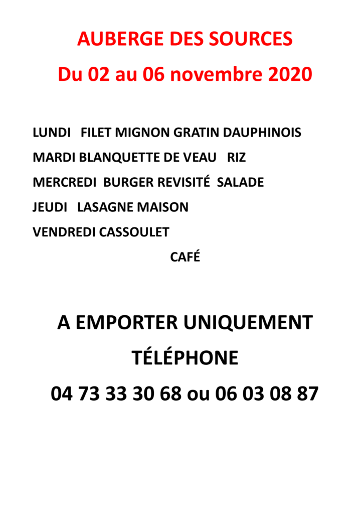 Veuillez trouver ci dessous le menu de l’auberge des Sources uniquement à emporter du 02 au 06 novembre 2020 Partager : Communauté