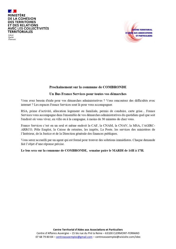 Prochainement sur la commune de Combronde, un bus France Services sera à votre disposition le mardi semaine paire de 14h00 à 17h00