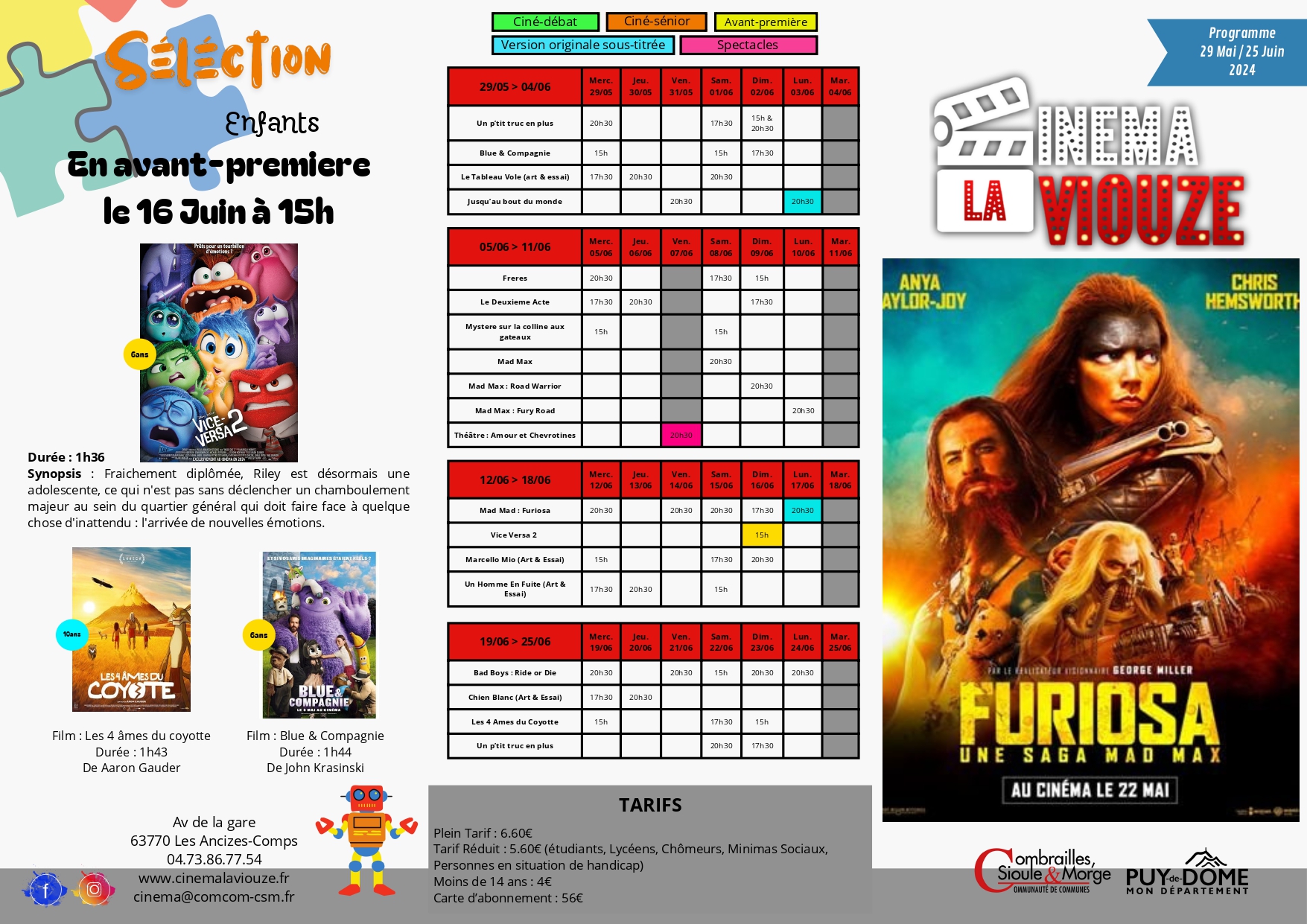 Veuillez trouver ci-dessous le programme de cinéma la Viouze du 29 mai au 25 juin 2024
