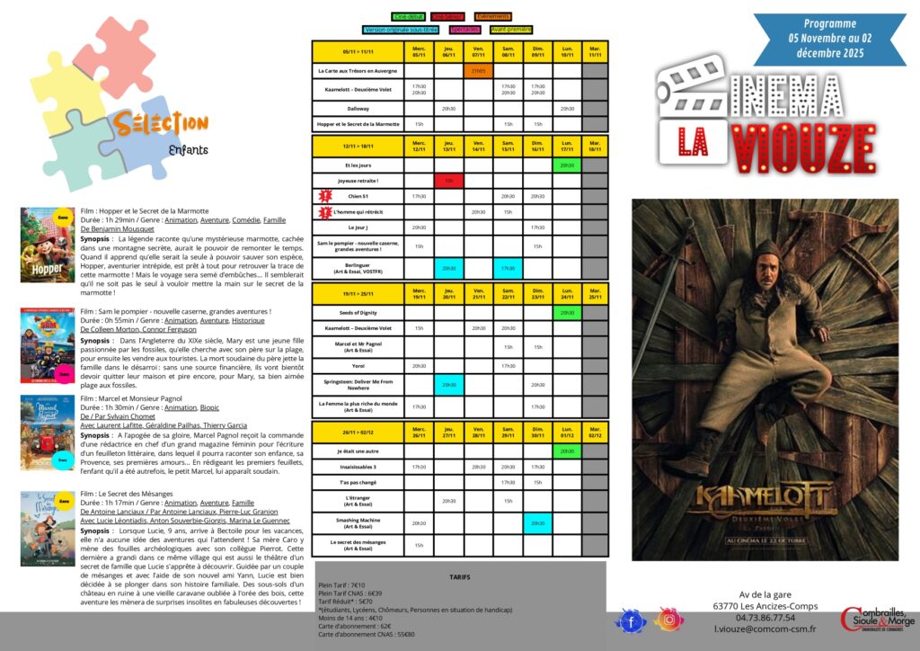 Veuillez trouver ci-dessous le programme du cinéma la Viouze du 05 novembre au 02 décembre 2025.