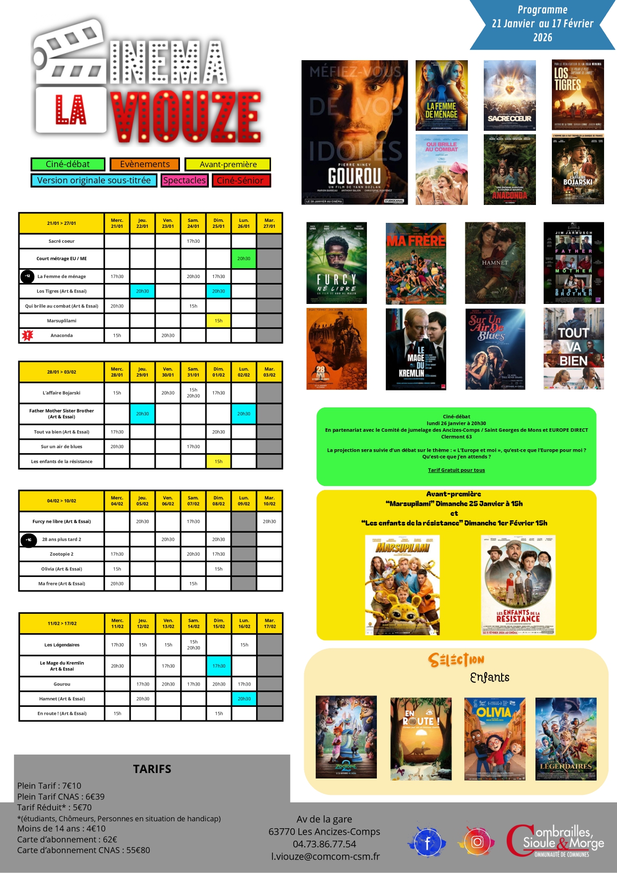 Veuillez trouver ci-dessous le programme du cinéma La Viouze du 21 janvier au 17 février 2026.
