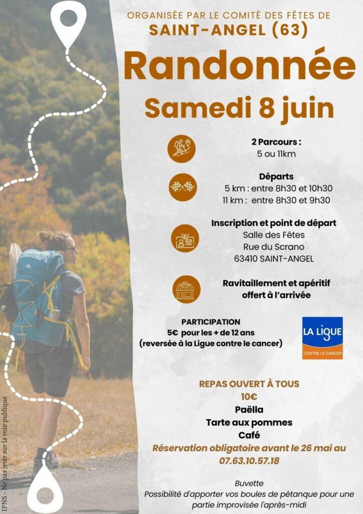 Le Comité des fêtes de Saint-Angel organise le samedi 08 juin 2024 une randonnée, réservation obligatoire avant le 26 mai 2024 au 07-63-10-57-18
