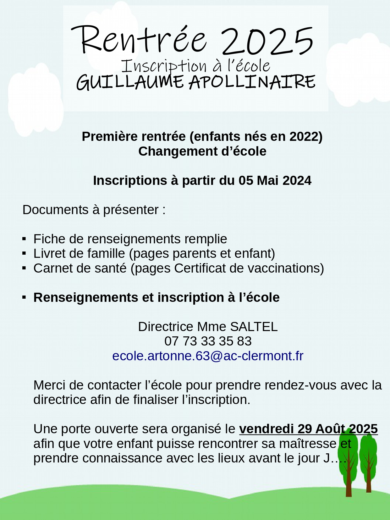 Rentrée 2025 Inscription à l’école Guillaume Apollinaire d’Artonne.