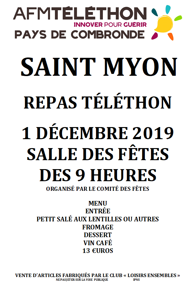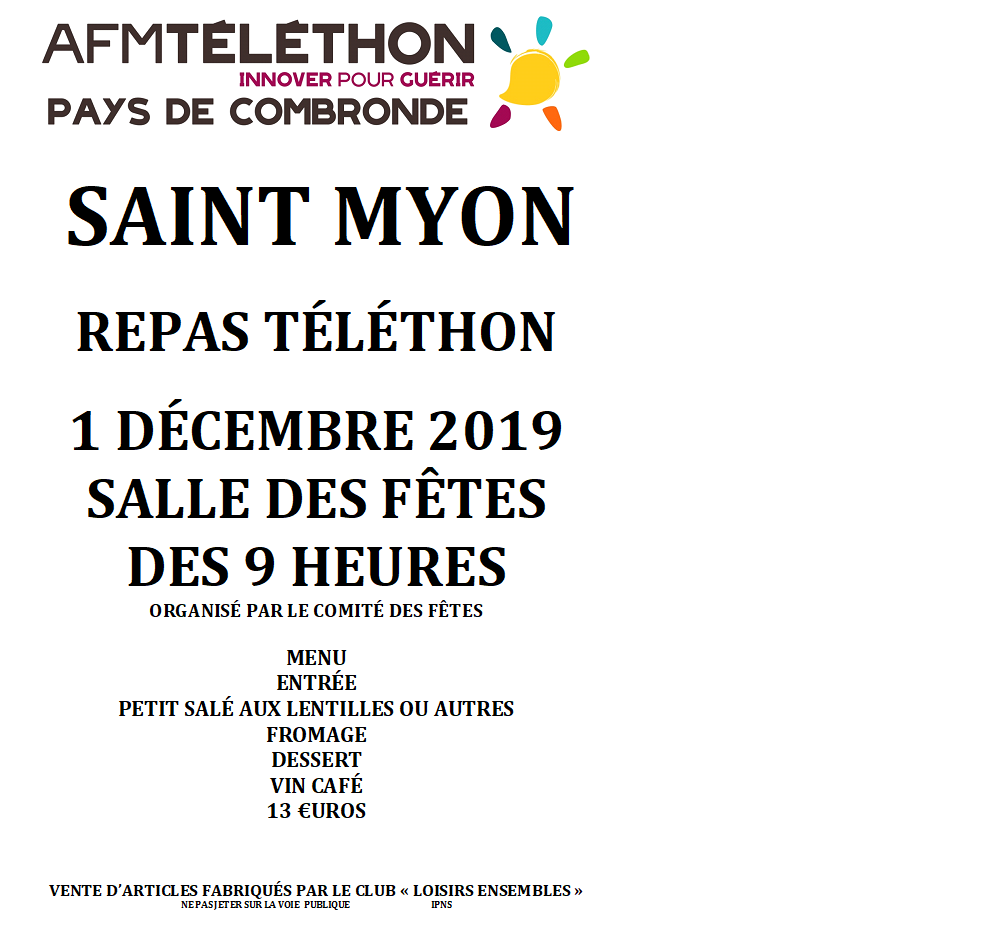 Repas du Téléthon le 1er décembre 2019 à partir de 09h00