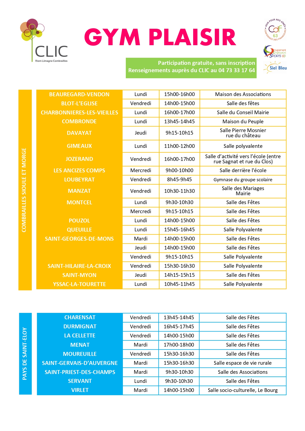 Reprise des cours Gym Plaisir via le CLIC Riom Limagne Combrailles le jeudi 04 septembre 2025 de 14h15 à 15h15 à la salle des fêtes de Saint-Myon.
