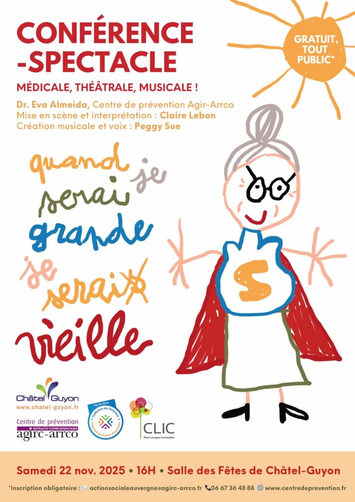 Samedi 22 novembre 2025 , à 16h00, à la salle des fêtes de Châtel-Guyon, conférence spectacle « quand je serai grande, je serai vieille ».
