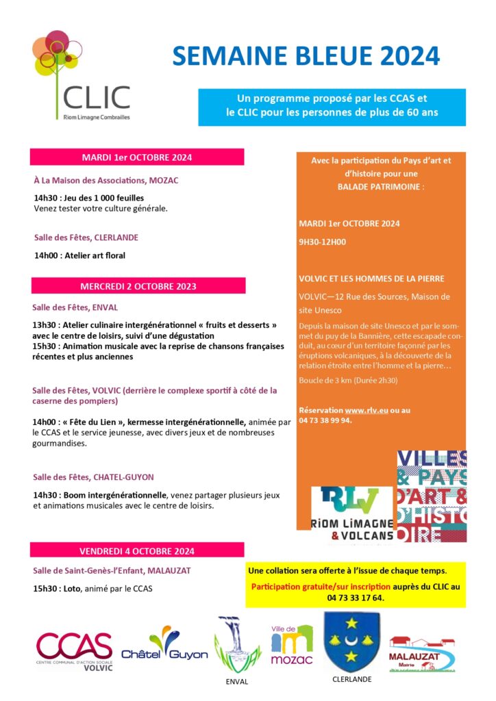 Semaine Bleue 2024 un programme proposé par les CCAS et le CLIC pour les personnes de plus de 60 ans.