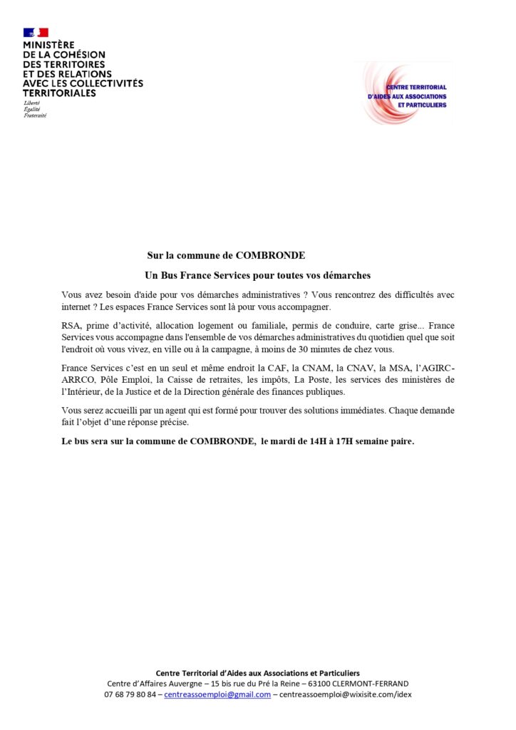 Un Bus France Services pour toutes vos démarches Sur la commune de COMBRONDE le mardi de 14h00 à 17h00 semaine paire