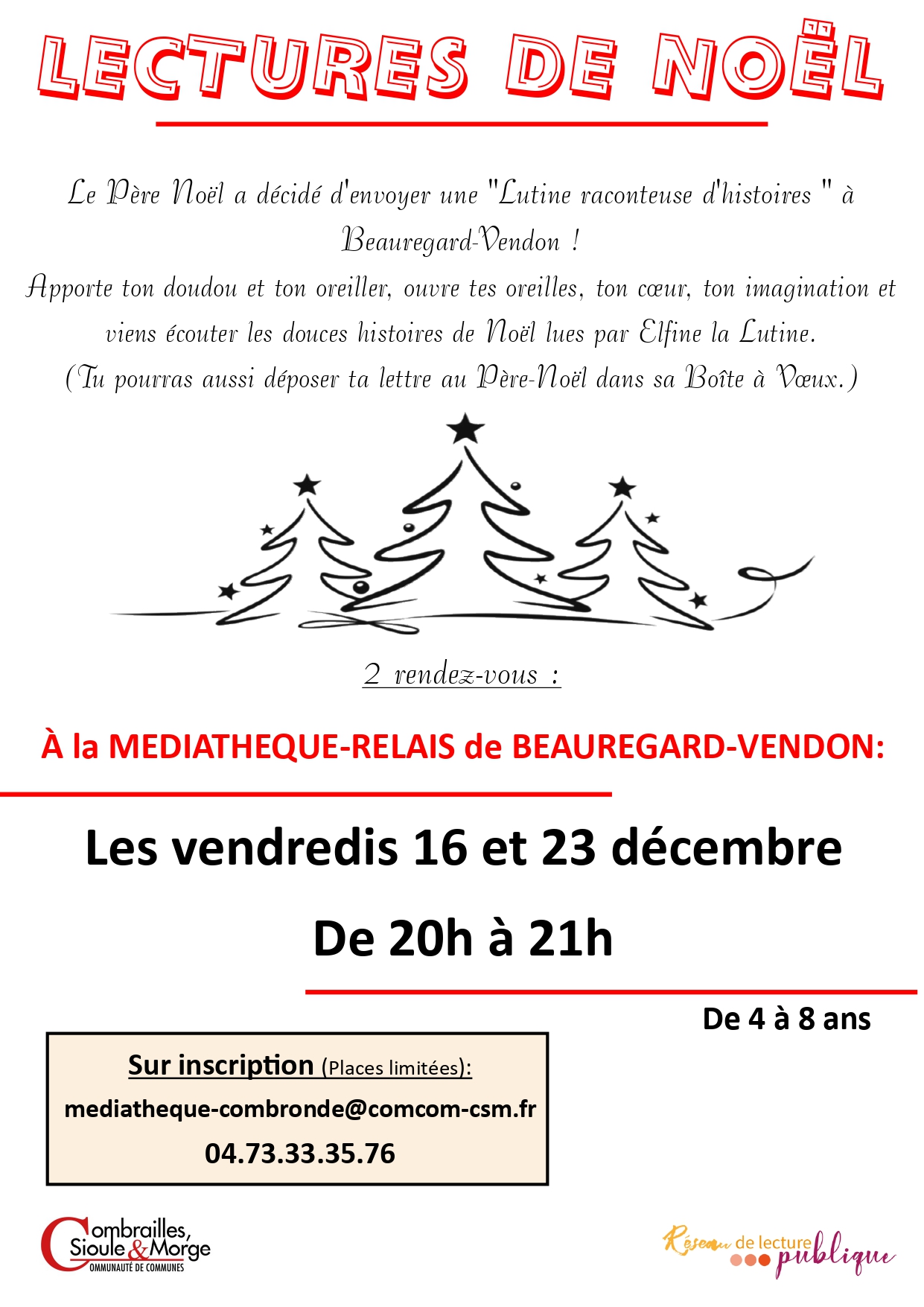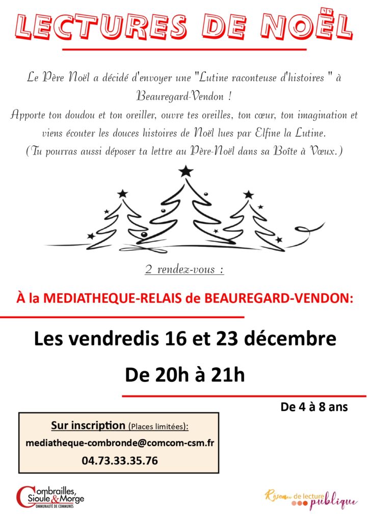 La médiathèque de Beauregard-Vendon organise le vendredi 16 et le vendredi 23 décembre 2022 des lectures de Noël